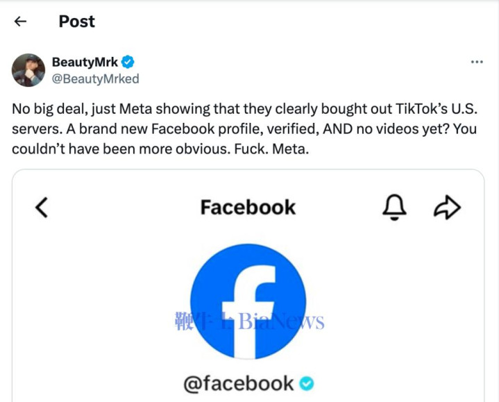 鞭牛士报道,1月22日消息,据海外辟谣网站Snopes报道,在TikTok两天前在美国恢复运营后,一些用户在X等平台上猜测,Facebook在这段期间,突然在TikTok上注册一个新账号,代表「Meta买下了TikTok在美国的服务器」。